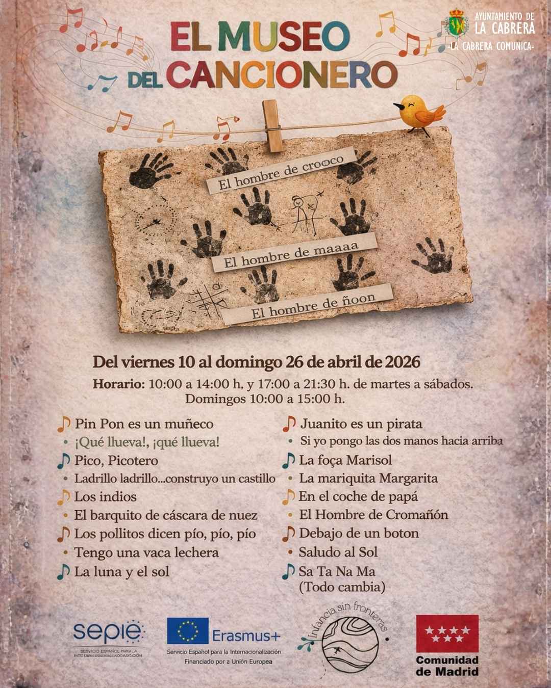 El próximo jueves 9 de abril se inaugura en el Centro Comarcal de Humanidades Sierra Norte una exposición muy especial: “El Museo del Cancionero”, una iniciativa que nace dentro del proyecto Erasmus+ Infancia sin Fronteras. Este proyecto, impulsado por la Casa de Niños de Valdemanco, se ha extendido a 19 centros educativos de la Sierra Norte, trabajando de forma conjunta con alumnado, familias y educadores para dar forma a esta propuesta artística común.